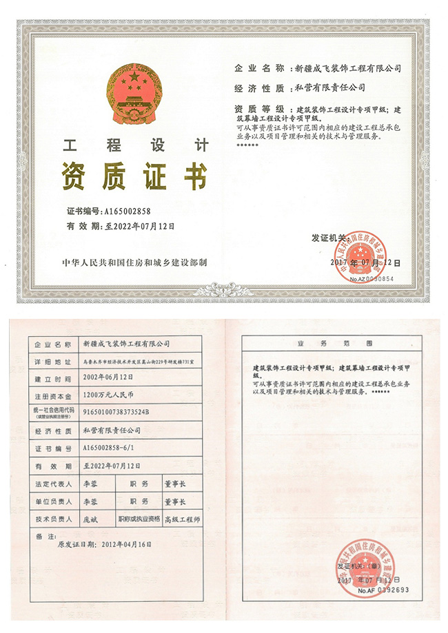 新疆成飛建設(shè)工程有限公司是一家以專注于裝飾工程領(lǐng)域,堅(jiān)持穩(wěn)健經(jīng)營(yíng)、持續(xù)創(chuàng)新、開放合作的原則,在星級(jí)賓館、高檔寫字樓、大型商場(chǎng)、高級(jí)餐館、娛樂(lè)設(shè)施、車站、銀行等大型室內(nèi)外建筑工程(包括各類玻璃幕墻、石材幕墻、鋁板幕墻、鋼結(jié)構(gòu)室內(nèi)裝飾等工程)裝飾裝修...查看更多